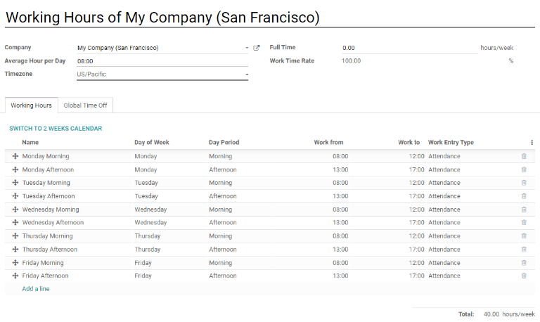 Thời gian làm việc là cụ thể của công ty. Mỗi công ty phải xác định từng loại thời gian làm việc họ sử dụng. Ví dụ, cơ sở dữ liệu ODOO chứa nhiều công ty sử dụng tuần làm việc 40 giờ tiêu chuẩn cần có một mục thời gian làm việc riêng cho mỗi công ty sử dụng tuần làm việc tiêu chuẩn 40 giờ.
