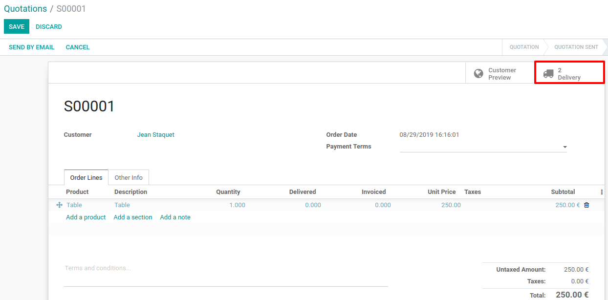 Sau khi hoàn thành, hãy tạo đơn đặt hàng cho sản phẩm và xác nhận nó. Odoo sẽ tự động tạo hai chuyển khoản sẽ được liên kết với đơn đặt hàng. Đầu tiên là chuyển từ Vị trí đầu vào sang Vị trí đầu ra *, tương ứng với việc di chuyển của sản phẩm trong khu vực *chéo. Cái thứ hai là thứ tự phân phối từ vị trí Đầu ra đến vị trí Khách hàng *của bạn. Cả hai đều ở trạng thái *chờ đợi một hoạt động khác vì chúng tôi vẫn cần đặt hàng sản phẩm cho nhà cung cấp của chúng tôi.