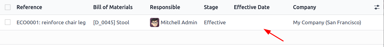 Điều này có nghĩa là ECO0012 đang sửa đổi lỗi thời BoM. Như được hiển thị trong Tab thay đổi Eco trước đây, BoM đang thiếu Ổn định không gian.
